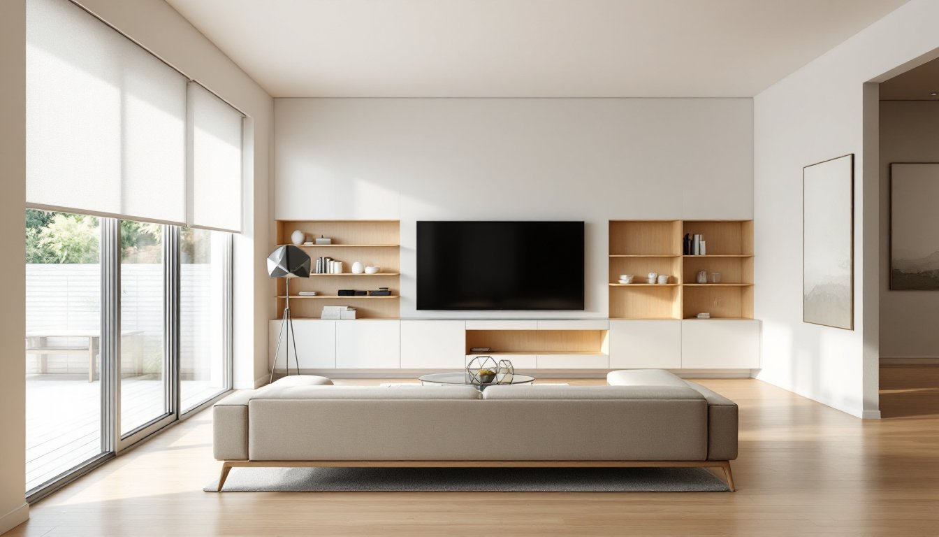 Storage solutions in modern design are built-in or custom whenever possible. Open shelving is acceptable if kept organized and minimal: closed cabinetry in the same finish as the wall can virtually disappear, creating a seamless, clutter-free appearance. For living room home interior design, a low media console in natural wood or matte lacquer, paired with wall-mounted shelving, is far more on-brand than a traditional entertainment center.